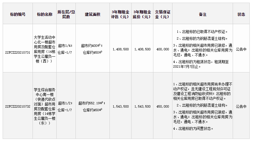 注:对于上表列示“租赁状态”的出租标的,如非原承租方竞得,则自本次承租方签订《房屋租赁合同》之日起10个工作日内,由出租方负责出租标的原承租方的撤离清场工作,并按出租标的原承租方撤离清场后的现状移交给本次承租方。