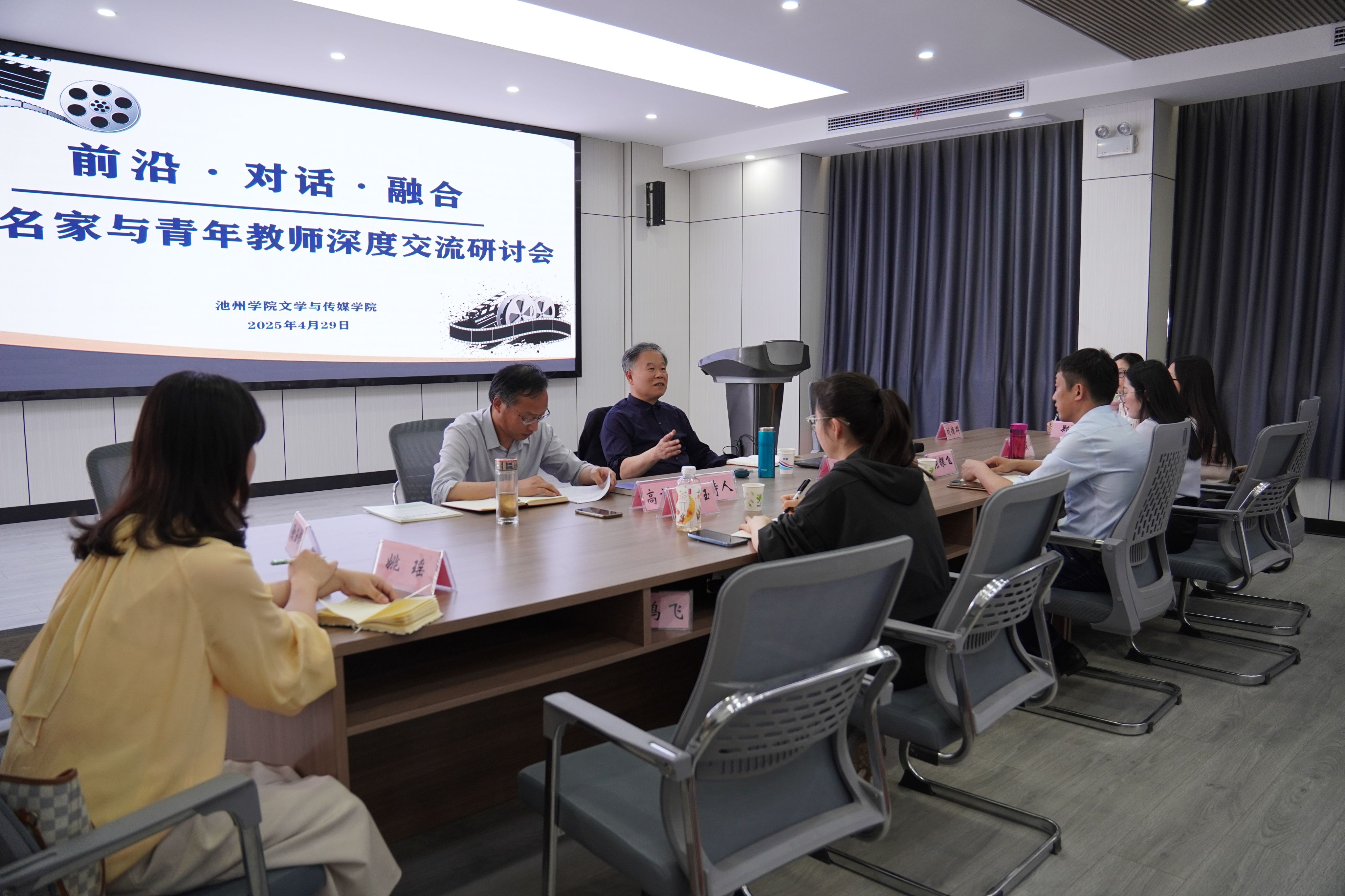 4月29日下午,张智华在博物楼视听实训室为学院青年教师作专题学术讲座。张智华详细分析了学科特点和优势,阐述了中国语言文学、新闻传播学、戏剧与影视三个学科交叉融合的研究领域和方向,并指出学院要建立“教学+科研+创作”三位一体的教育教学新模式。张智华还结合自身的学术经历和研究成果,以深入浅出的方式讲解了学术论文的写作方法和技巧。参会教师就各自在学术研究中遇到的困惑和挑战与张智华进行了交流。