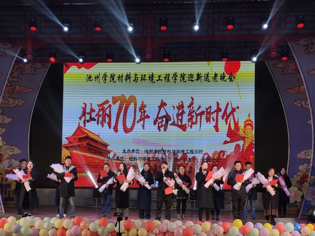 12月9日,材料与环境工程学院“壮丽七十年,奋进新时代”迎新晚会在博古礼堂隆重举行。校党委书记孙晓峰出席晚会,校团委书记程海峰,学生处副处长(主持)方文利,学生处副处长吴国志,材料与环境工程学院党委书记何贵林,副院长汪鹏飞以及学院师生代表近500人参加了本次晚会。
