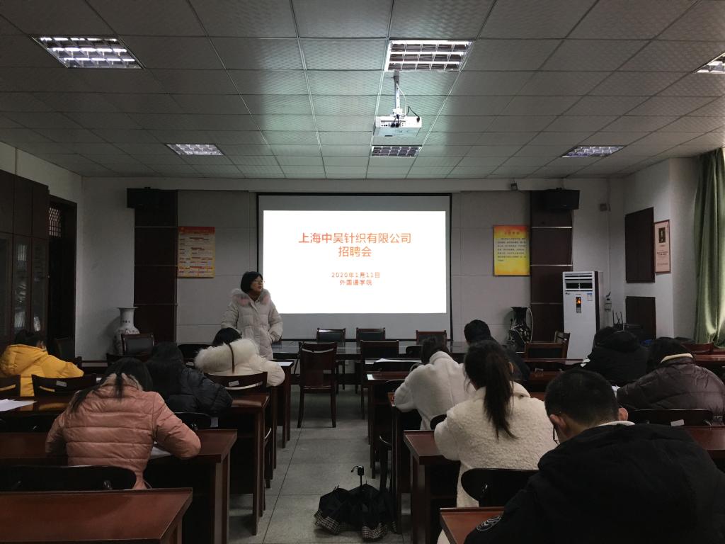 在外国语学院会议室举行了上海中昊针织有限公司专场招聘会。上海中昊针织有限公司成立于2000年,是一家专营袜类产品的出口的民营企业,上海总部自有厂房10万平方米。产品100%出口,主要出口欧美、日本、澳大利亚、俄罗斯等二十几个国家和地区 。经过20年的不懈努力,公司连续至今袜类出口为全国第一并且遥遥领先于同行,是行业龙头企业。此次招聘会,共有近20名学生参加。