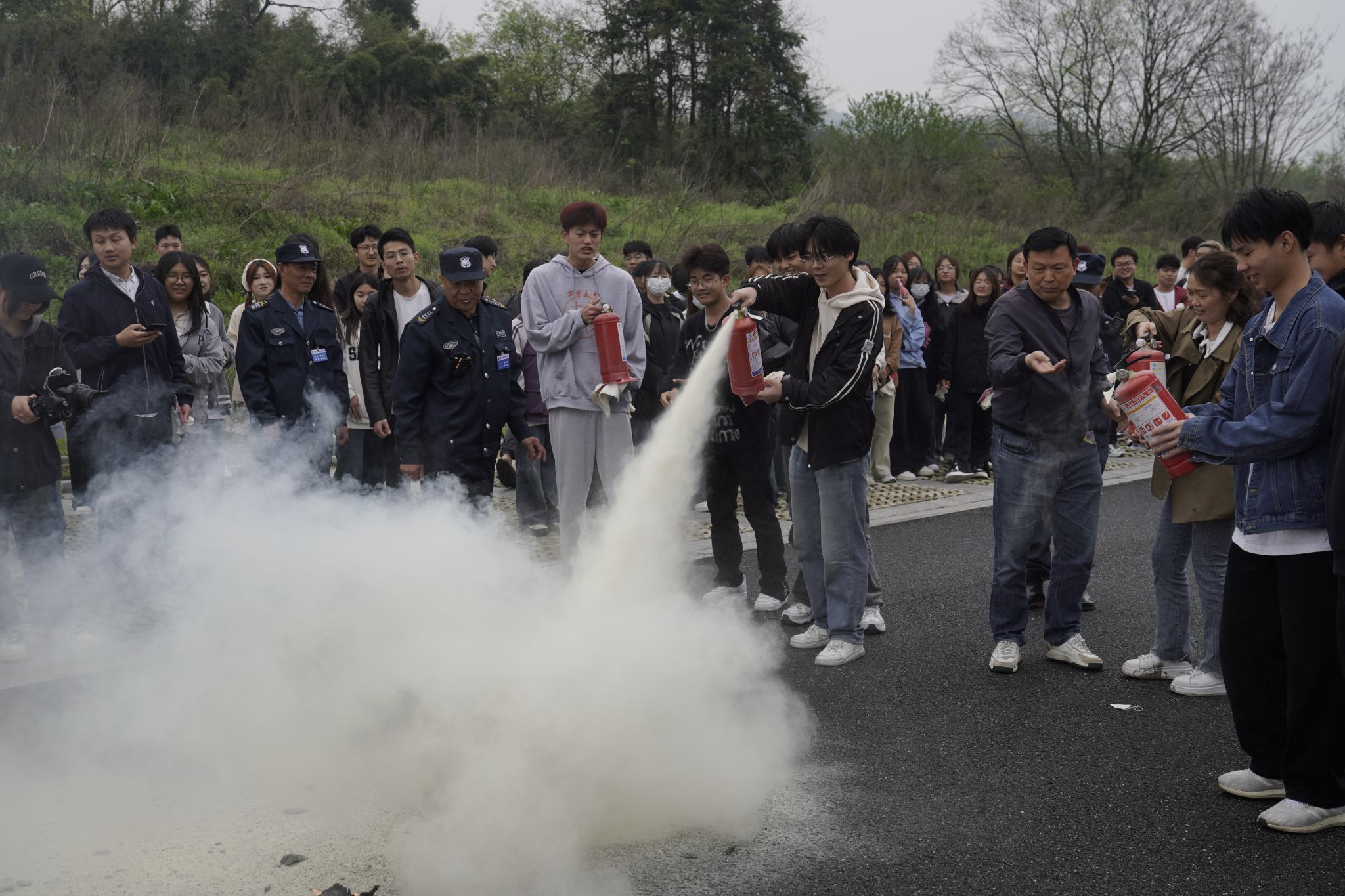 疏散逃生演练后,保卫处组织学生现场观摩灭火器的正确使用方法,并指导学生进行模拟灭火操作。