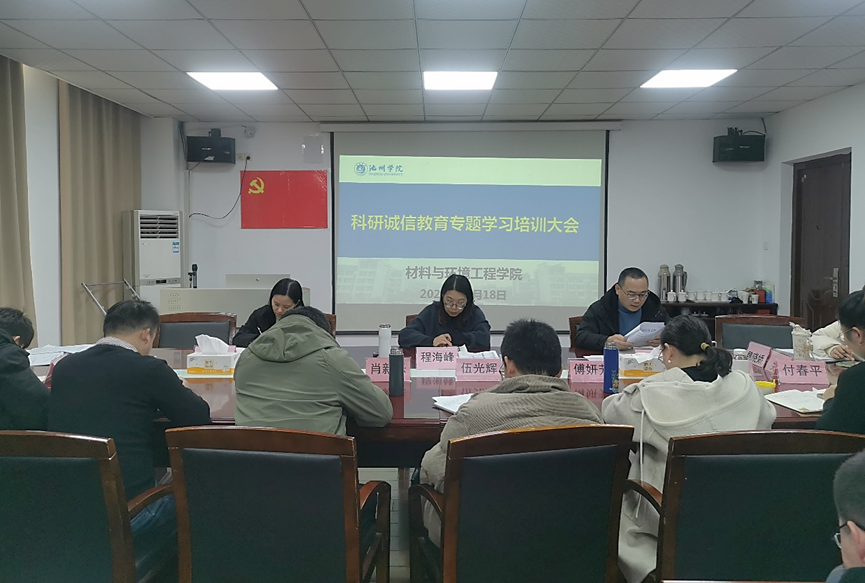 12月18日下午,材料与环境工程学院科研诚信教育专题学习培训会在逸夫南楼三楼会议室召开。本次会议由副院长昌杰主持,全体教职工参会。