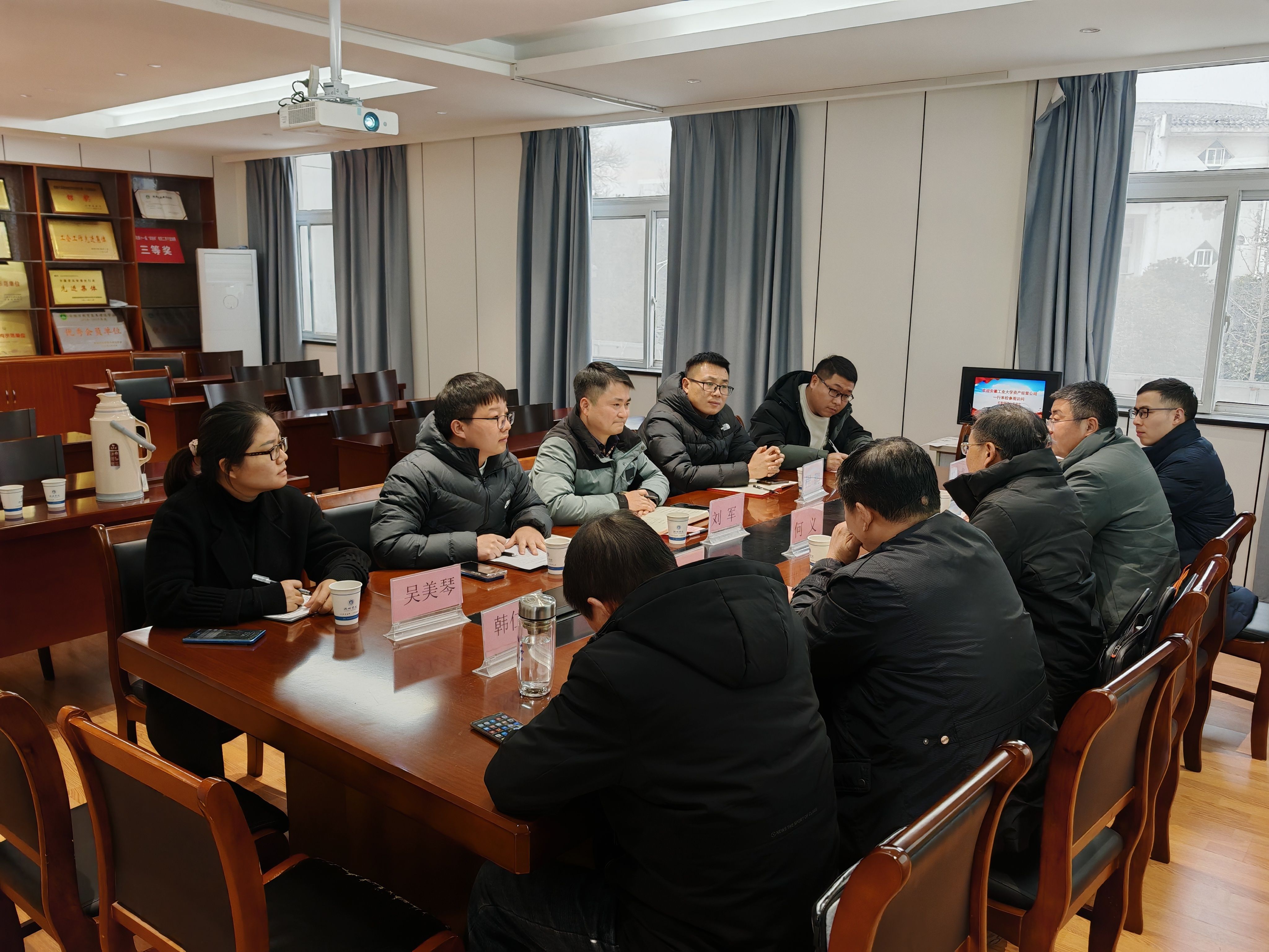 1月14日下午,安徽工业大学资产经营公司总经理何义一行来beat365官网调研交流。beat365官网后勤管理与基建处领导及相关科室工作人员参加会议。会议由副处长刘军主持。