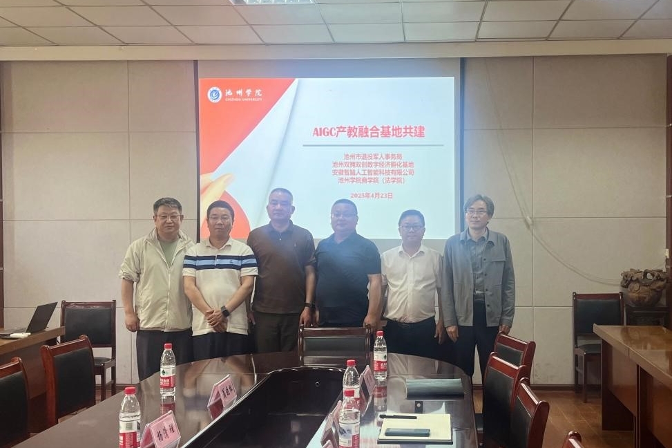 为深化产教融合、服务区域数字经济与退役军人职业发展,4月23日下午,商学院(法学院)联合安徽智脑人工智能科技有限公司、池州市退役军人事务局及池州双拥双创数字经济孵化基地,共同签署“AIGC产教融合基地共建协议”。签约仪式由院长吴自爱主持,市退役军人事务局副局长杨清理、厚信控股董事长徐汪伟、安徽智脑公司执行董事翁晓松以及商学院(法学院)党委书记肖宁生、副院长吴义根等出席仪式。