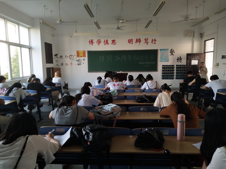 本次主题系列活动内容丰富,由“建国70周年纪念徽设计大赛”、“爱国主题海报设计大赛”和“建国70周年知识竞赛”三部分组成。同学们结合主题及兴趣特长选择性参加。纪念徽、海报设计各作品来稿主题鲜明、创意十足,通过不同方式表达了爱国之情;知识竞赛以现场作答的形式开展,各参赛人员认真仔细答题。最终,17地科2班丁悦、18人文2班司佳和18人文2班顾宪雨分别获得海报设计、纪念徽章设计和知识竞赛一等奖。