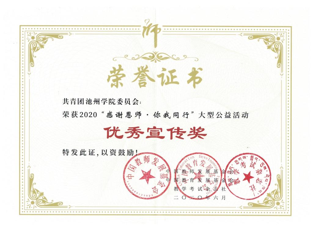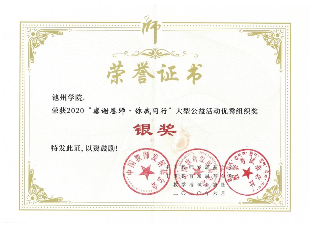 近日,2019年度“感谢恩师·你我同行”大型公益活动圆满结束,beat365官网荣获全国“优秀组织奖银奖”、全国“优秀宣传奖”等荣誉称号,文学与传媒学院叶静同学荣获全国“优秀传承奖”,外国语学院周红同学、旅游与历史文化学院陈蓉同学荣获“优秀感恩大使”荣誉称号。