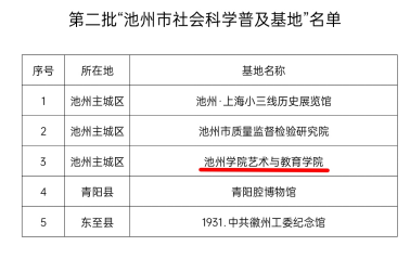 近日,池州市社会科学界联合会公布了第二批“池州市社会科学普及基地”名单,beat365官网艺术与教育学院名列其中。