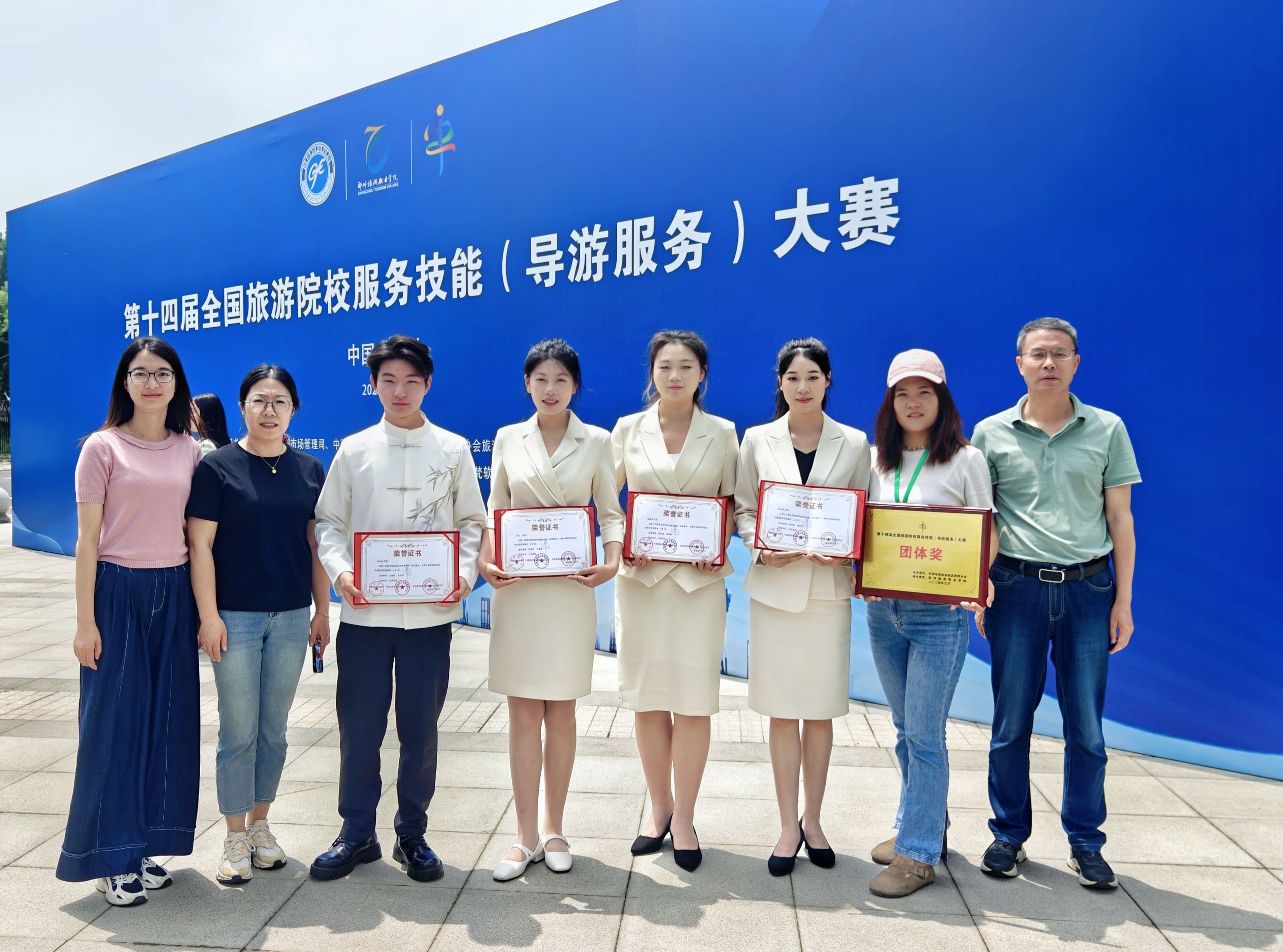 5月23日-26日,第十四届全国旅游院校服务技能(导游服务)大赛在河南郑州举办。beat365官网2021级旅游管理对口班陈双晴、2023级旅游管理对口2班何家豪分别获得全国高等院校普通话组二、三等奖,2021级旅游管理1班刘庆、2022级旅游管理1班程毓琪获得全国高等院校英语组三等奖,团队总成绩排名全国前20%,荣获大赛团体奖。
