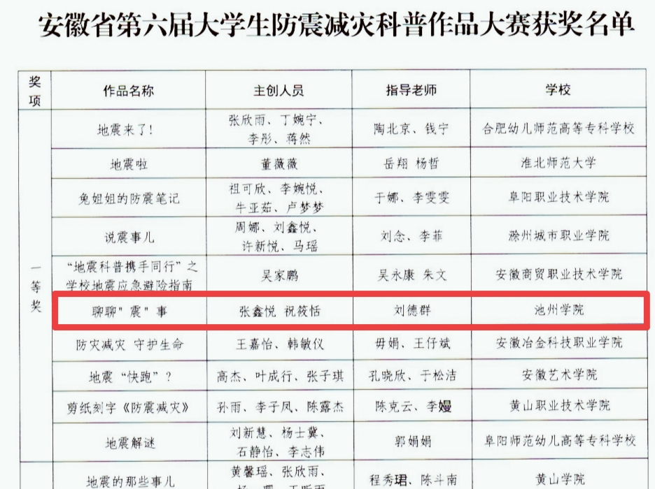 近日,安徽省第六届大学生防震减灾科普作品大赛获奖名单揭晓,beat365官网张鑫悦、祝筱恬同学创作《聊聊“震”事》(指导教师:刘德群)在众多参赛作品中脱颖而出,荣获大赛一等奖。
