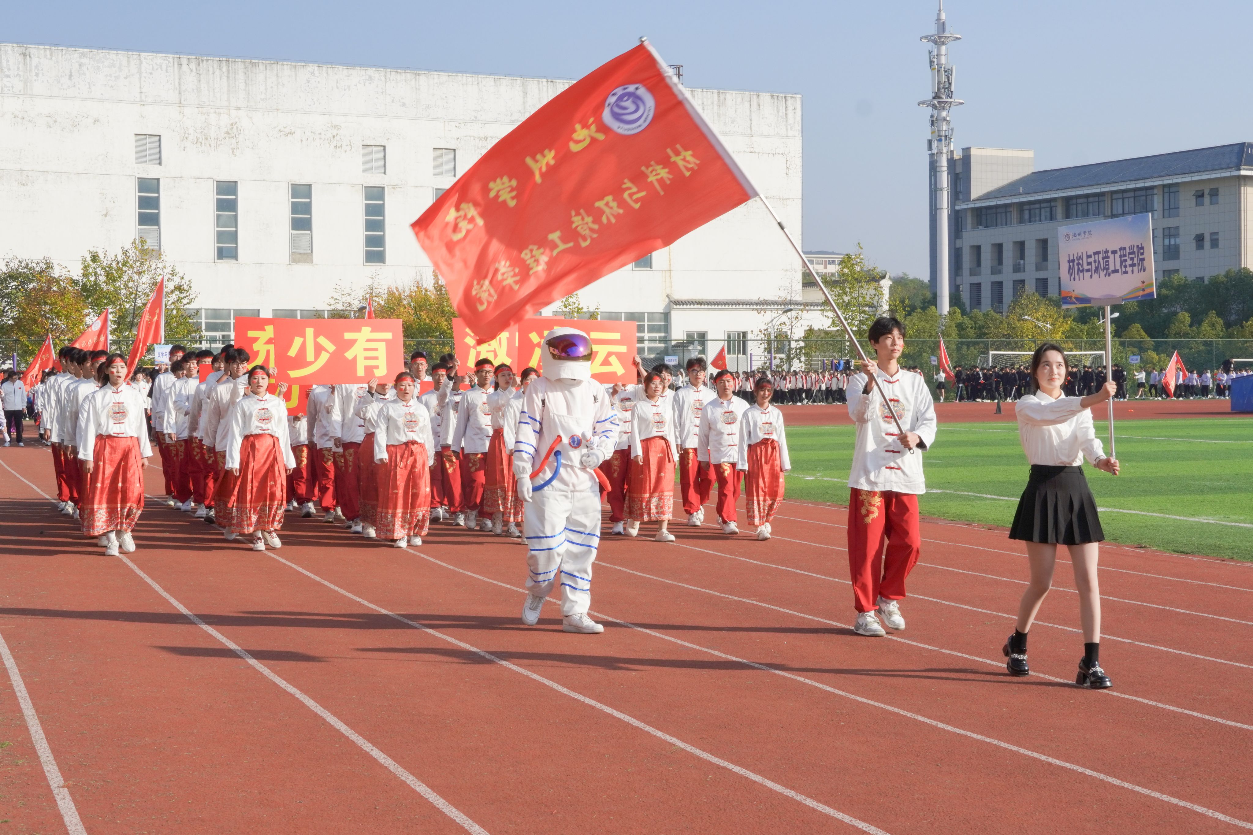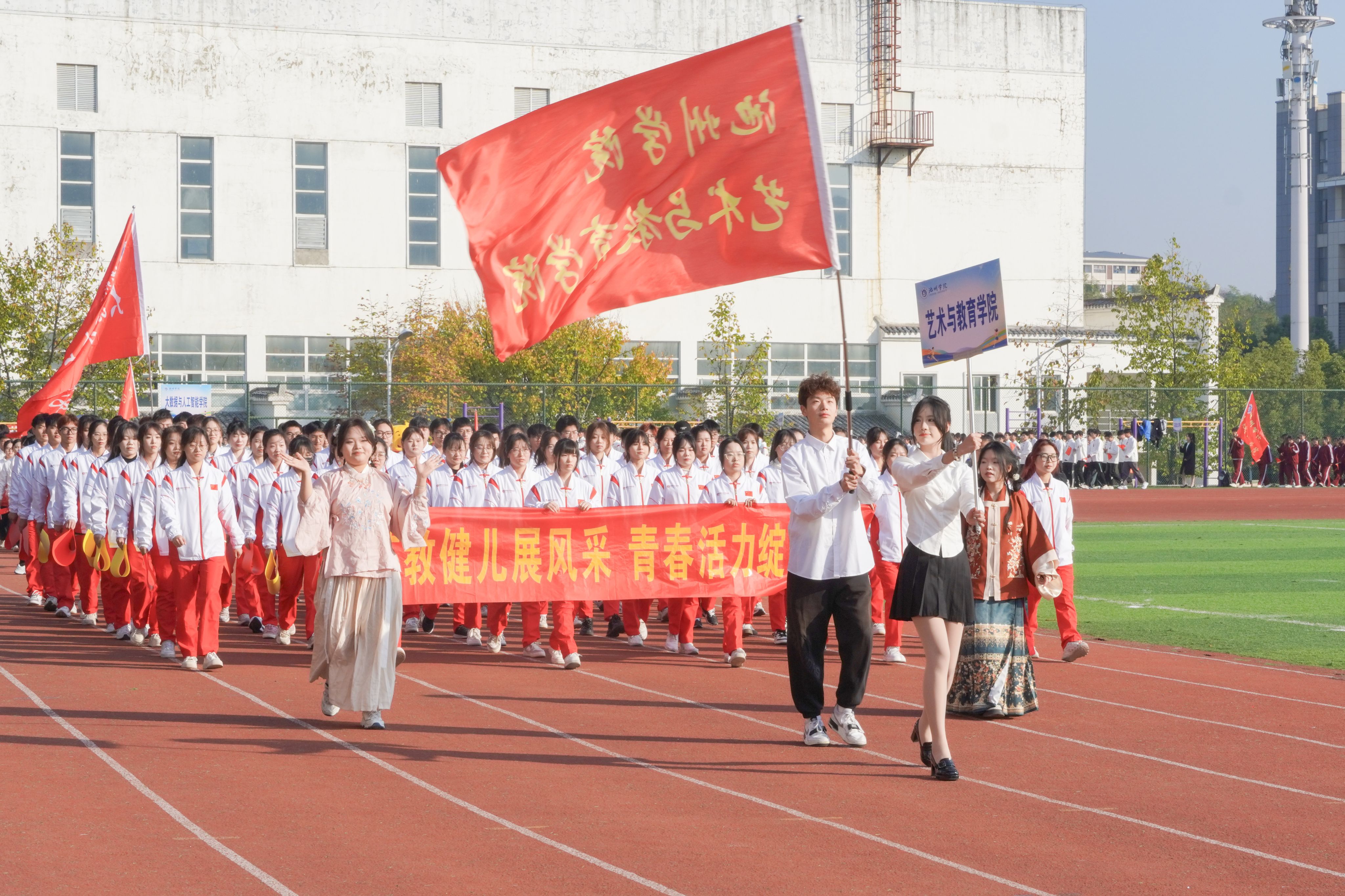 各方阵依次通过主席台,接受主席台检阅,彰显了广大师生昂扬向上的精神风貌。