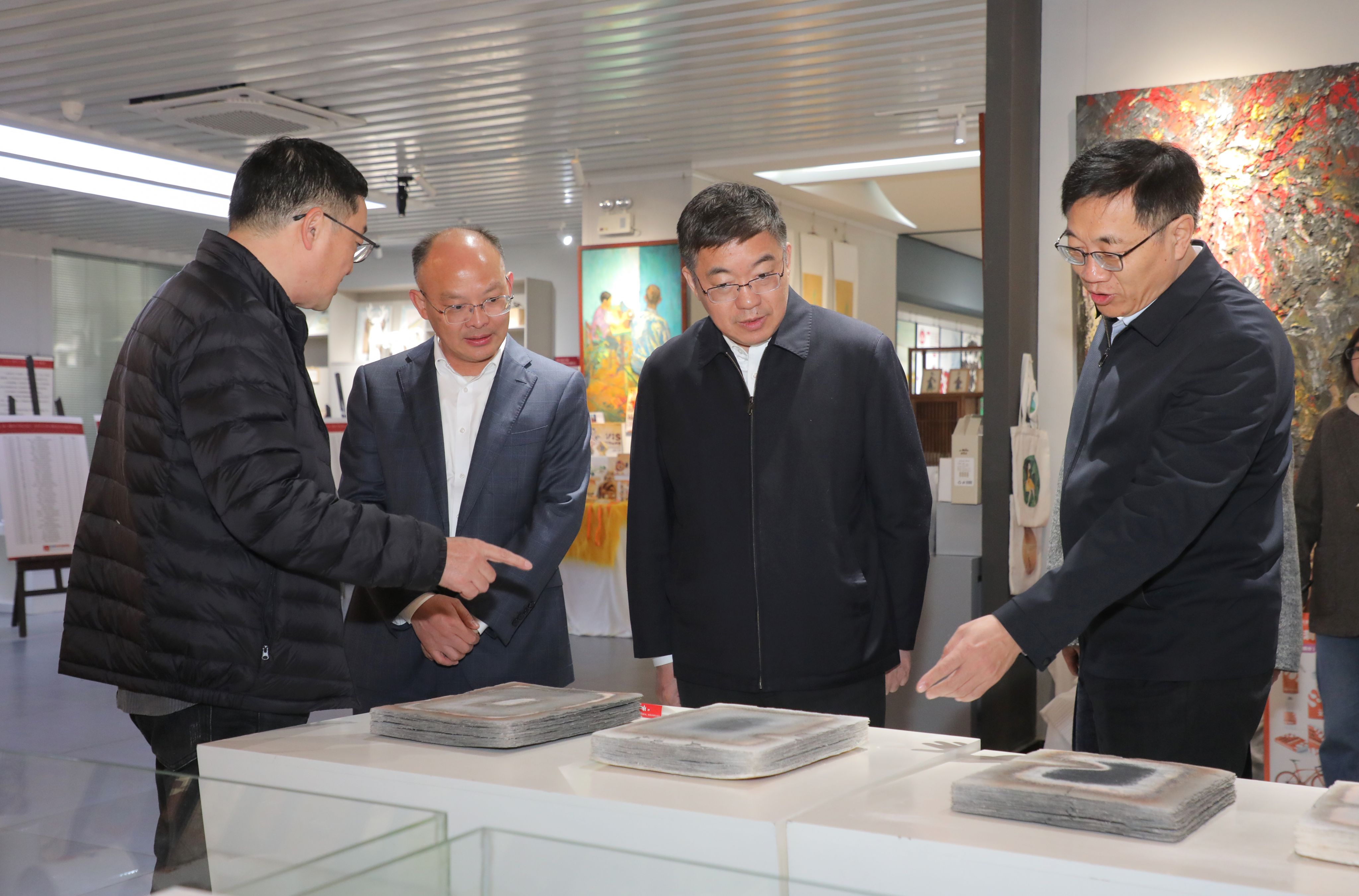 在艺术与教育学院美育基地,朱浩东详细了解了学校美育体系建设及服务地方经济社会发展情况,对学校推动文化育人工作给予充分肯定。他表示,要立足池州市文化资源禀赋和产业发展需求,深入挖掘和运用好池州文化资源及旅游价值,推动优秀传统文化创造性转化创新性发展,持续深化政校企深度融合,积极探索产学研协作新模式。