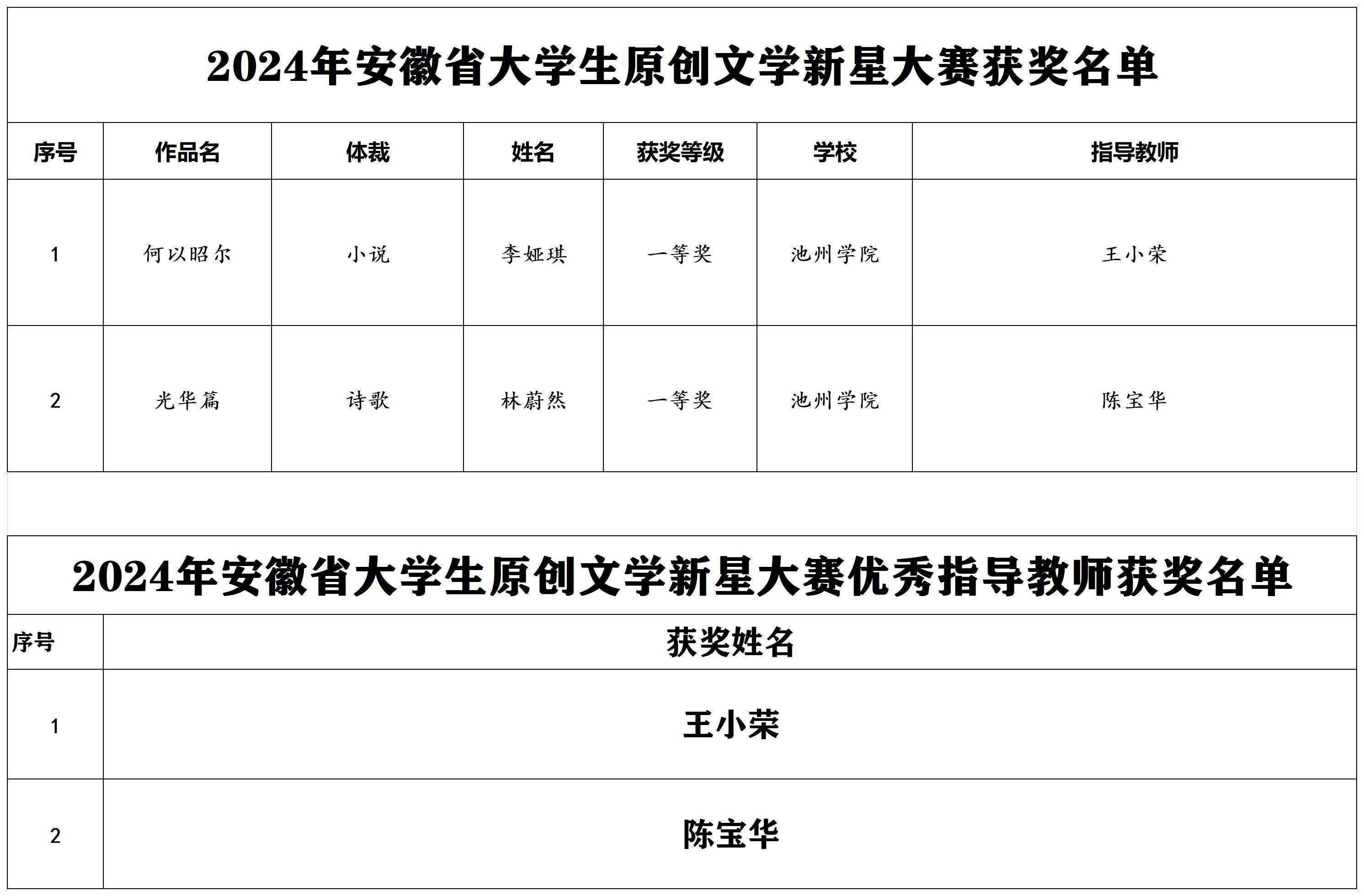 12月18日,2024年安徽省大学生原创文学新星大赛落下帷幕。beat365官网文学与传媒学院学子荣获一等奖2项,王小荣、陈宝华老师荣获“优秀指导教师”称号。