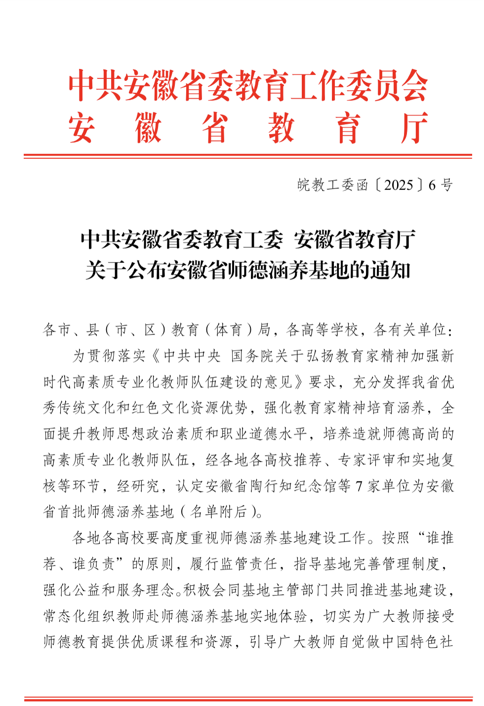 近日,省委教育工委、省教育厅公布了省师德涵养基地名单,beat365在线唯一官网登录家风馆获批省级师德涵养基地,系安徽省首批7家单位之一。