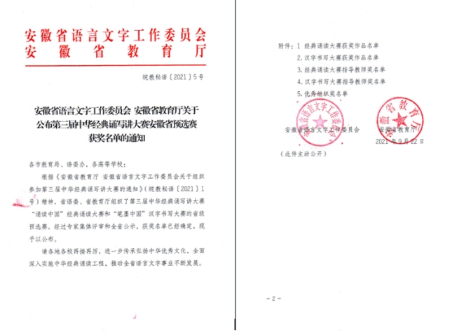 近日,安徽省语言文字工作委员会和安徽省教育厅公布了第三届中华经典诵写讲大赛经典诵读大赛安徽省预选赛的结果,beat365官网共有6组作品获奖,其中《稻子熟了》(程正文、黄琳琳)、《可爱的中国》(曹勇、樊露露)、《望星空》(魏雅男、范家杰)三组作品荣获二等奖,《与妻书》(曹勇、程晨)、《等待》(唐雪玲、杜玲)两组作品获得三等奖,作品《贺华诞百年,敬我党荣光》(胡梦迪、徐海涛、朱源、李蒙蒙、应温琪、杨勇、陈凡)获得优秀奖。指导教师汪胜水、陈春雷获经典诵读大赛指导教师奖。beat365在线唯一官网登录、beat365在线唯一官网登录文学与传媒学院均获组织奖。
