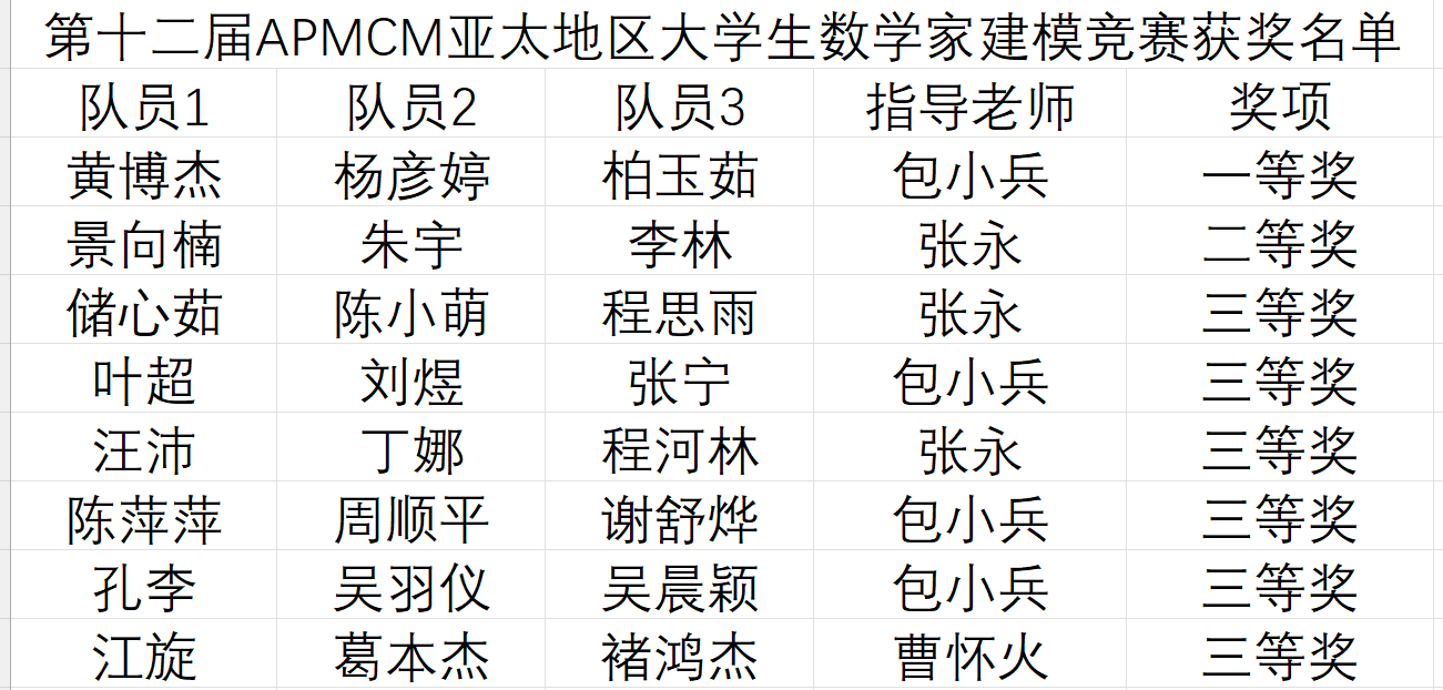 beat365官网从2022年10月开始组织竞赛,经过选拔,选出了十二支队伍代表beat365官网参加2022年APMCM亚太地区大学生数学建模竞赛。竞赛期间,在曹怀火教授、张永副教授、包小兵副教授的指导下,十二支参赛队均成功提交了英文参赛论文。