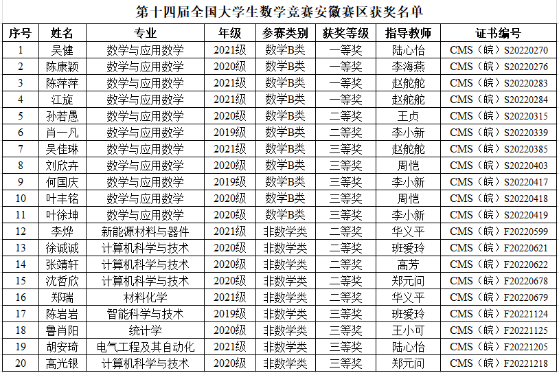 近日,第十四届全国大学生数学竞赛安徽赛区结果揭晓,来自大数据与人工智能学院的吴健、徐诚诚,材料与环境工程学院的李烨、郑瑞,机电工程学院(半导体学院)的胡安琦等20位同学获奖,其中,来自数学与应用数学专业的吴健、陈康颖、陈萍萍、江旋4位同学获得数学B类一等奖,全省数学B类一等奖获奖45人,beat365官网占近十分之一。