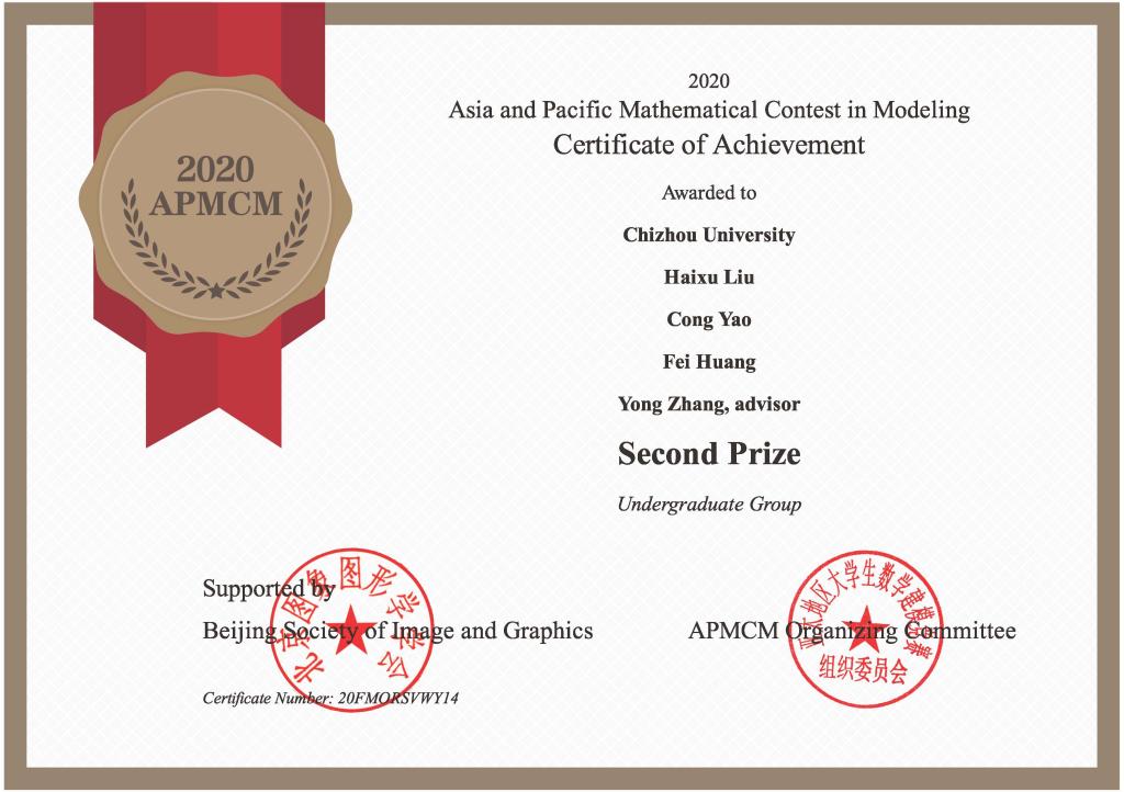 近日,2020年亚太地区大学生数学建模竞赛成绩揭晓,beat365官网学子喜获国际二等奖两项、三等奖一项。大数据与人工智能学院教师张永指导的刘海旭、黄斐、姚聪联队和包小兵指导的周月娥,冯筱惠,曹雨晴团队获得国际二等奖,张永指导的陈纪怡,刘莉芳,龚淑娟团队获得国际三等奖。