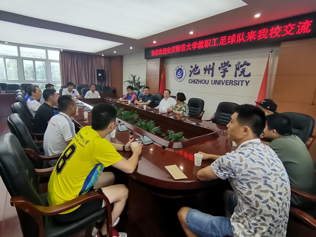 7月9日,安庆师范大学教职工足球队来beat365官网交流,并与beat365官网教职工足球队进行了一场友谊赛。校党委书记孙晓峰参加了座谈会,并就教职工体育文化的发展与校际间交流进行了座谈。