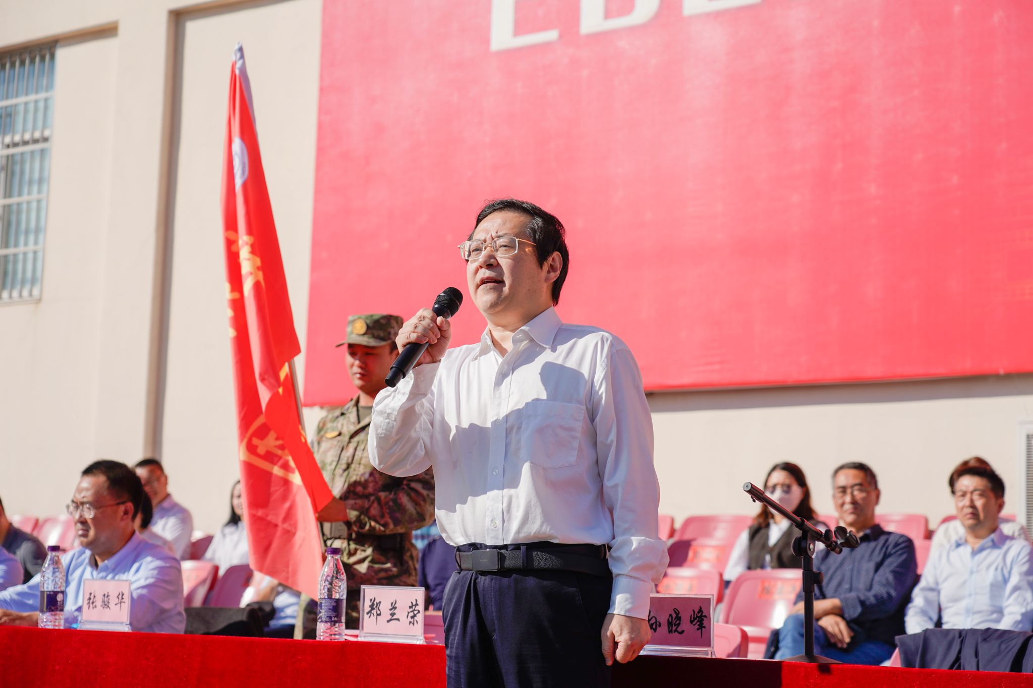 党委副书记、院长郑兰荣做军训动员讲话。她代表学校向承训部队全体官兵表示感谢,对参训学生提出三点要求:一要树立“一切行动听指挥”的纪律意识。在训练中练作风、练意志、练体格,养成能吃苦、守纪律的好习惯,通过军训磨炼意志、更好成长,更好融入大学这个象牙塔。二要树立“团结就是力量”的合作意识。在训练过程发扬团结友爱、同甘共苦、互帮互助的优良作风,培养良好的集体协作精神,把小我融入大我之中,携手并进、相互扶持、共同成长,在刻苦训练中激发集体荣誉感,练出战斗力、凝聚力、向心力。三要树立“安全重于泰山”的责任意识。将“安全第一”的思想贯穿军训全过程,时刻紧绷安全这根弦,科学训练、张弛有度、劳逸结合,以良好的精神面貌和坚韧的品质续写大学生活的别样精彩,以飒飒军姿彰显青春力量。
