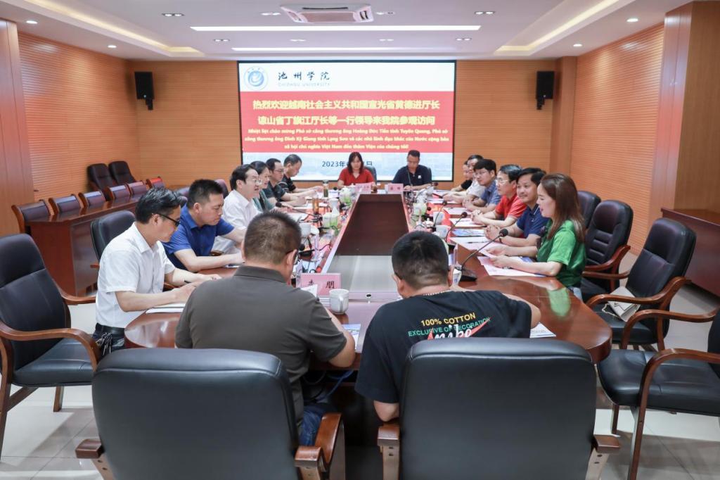 6月11日下午,越南宣光省工贸厅副厅长黄德进(HOANG DUC TIEN)、越南谅山省工贸厅副厅长丁旗江(DINH KY GIANG)、越南宣光省人民政府专家代表黄英尊(HUONG ANH TUAN)、越南宣光省中文学校校长阮氏玉娥(NGUYEN THI NGOC NGA)等一行来校访问。安徽省侨联经济科技部(海外联系部)部长宋德琴陪同来访。党委书记孙晓峰热情接待并主持召开了座谈会,党委副书记、院长郑兰荣出席会议。