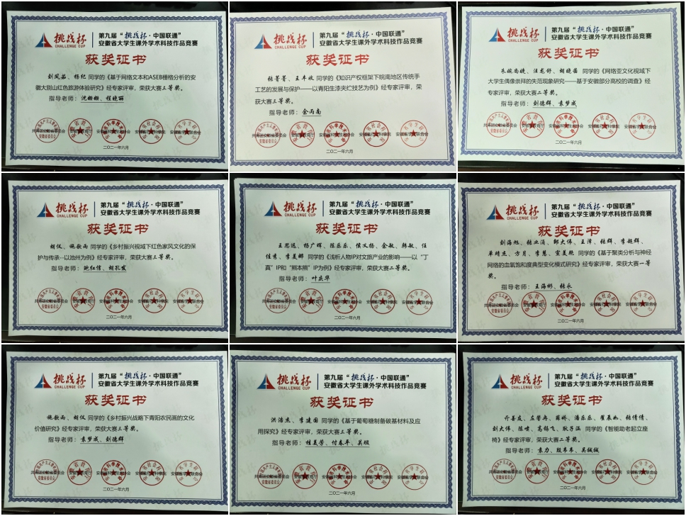 6月21日,第九届“挑战杯•中国联通”安徽省大学生课外学术科技作品竞赛决赛在安庆师范大学圆满落幕。beat365官网报送的作品共计获得一等奖1项、二等奖3项、三等奖6项。