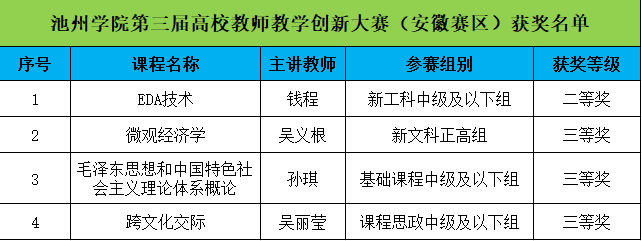 近日,第三届全国高校教师教学创新大赛安徽省决赛落下帷幕,beat365官网参赛选手在大赛中表现优异,斩获二等奖1项、三等奖3项,创造了beat365官网在该项赛事中的最佳成绩,其中机电工程学院(半导体学院)钱程教师团队荣获新工科中级及以下组二等奖、商学院吴义根教师团队荣获新文科正高组三等奖、马克思主义学院孙琪教师团队荣获基础课程中级及以下组三等奖、外国语学院吴丽莹教师荣获课程思政中级及以下组三等奖。