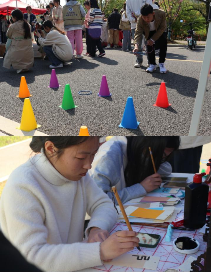 学生社团还开展了各种形式多样、内容丰富、极具特色的体验活动,现场设置了击鼓传花、流觞曲水、赏猜诗词、金鸡独立等趣味互动游戏。同学们被轻松愉悦的氛围感染,个个热情高涨,樱花大道上洋溢着欢声笑语。