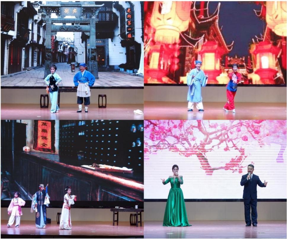 演出在闪耀的灯光和观众的期待中拉开帷幕。经典折子戏《闹花灯》清新自然的曲调、极具趣味性的唱词以及演员与台下观众的热情互动,引来现场笑声连连、掌声不断。在选段《太阳山上》《天仙配》《牛郎织女》《金玉奴》等经典剧目中,演员以真挚饱满的感情、娴熟精湛的动作、悠扬婉转的腔调,让现场师生们陶醉其中、回味无穷。黄梅小戏《打豆腐》的诙谐幽默、《戏牡丹》的丰富情节,引得观众频频叫好。经典对唱《海滩别》《夫妻双双把家还》等精彩表演让在场观众再一次品味经典。演出持续近两个小时,整场演出剧目丰富、精彩不断,演员们精湛、高超的演技让广大师生近距离地感受到了黄梅戏的艺术魅力和徽文化的精神内涵。