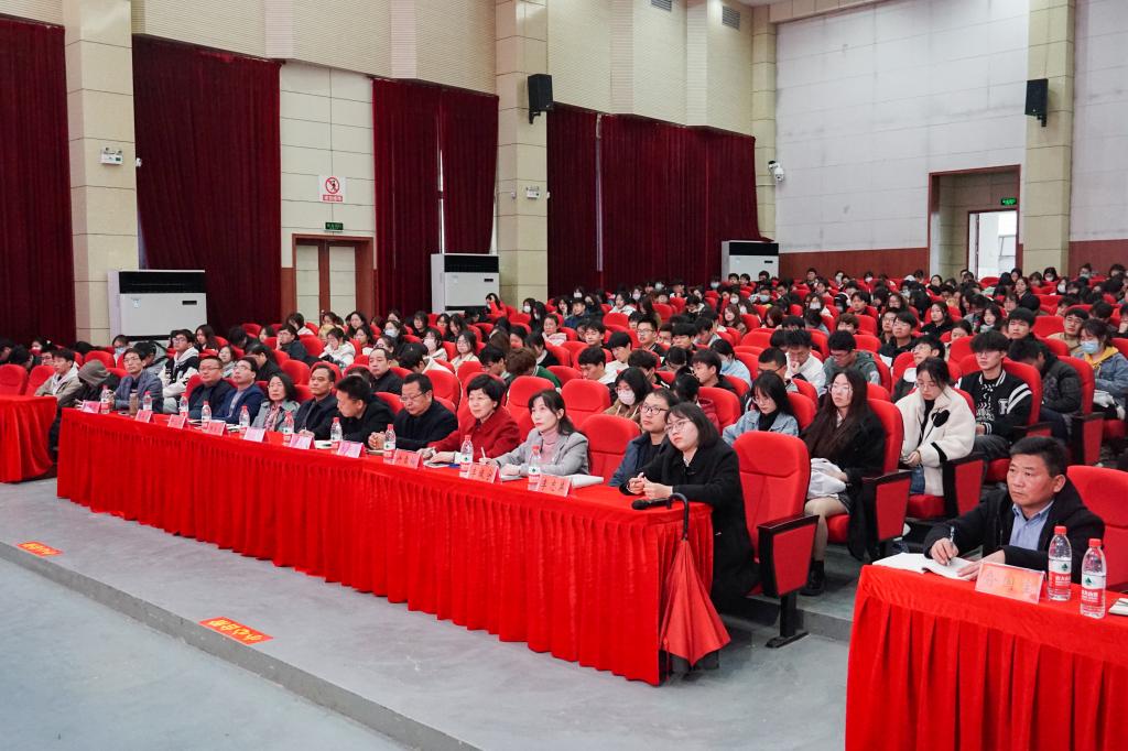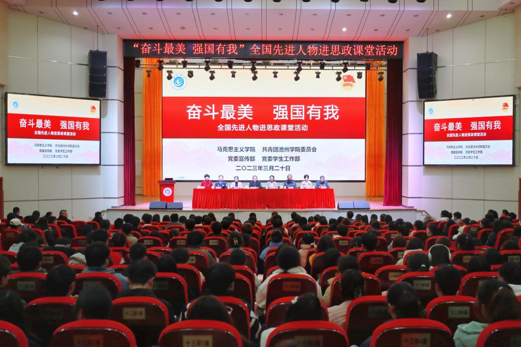 为深入学习贯彻党的二十大精神和全国两会精神,在学校掀起学习先进人物的热潮,构建生动活泼的大思政课堂。3月20日下午,beat365官网联合池州市教体局举办的“全国先进人物进思政课堂”活动在博古礼堂举行,党的二十大代表路丙辉教授、全国人大代表丁德芬、全国语言推广先进个人秦红艳、全国妇联先进个人吴浩应邀做先进事迹宣讲报告。院党委书记孙晓峰出席并致辞,院党委副书记、院长郑兰荣,池州市教体局副局长许雪梅出席。院党委副书记崔国发主持宣讲会。办公室、宣传部、学生处、团委、马克思主义学院和各二级学院的领导以及辅导员代表、学生代表、池州市思政课教师代表等共600余名师生聆听了报告。