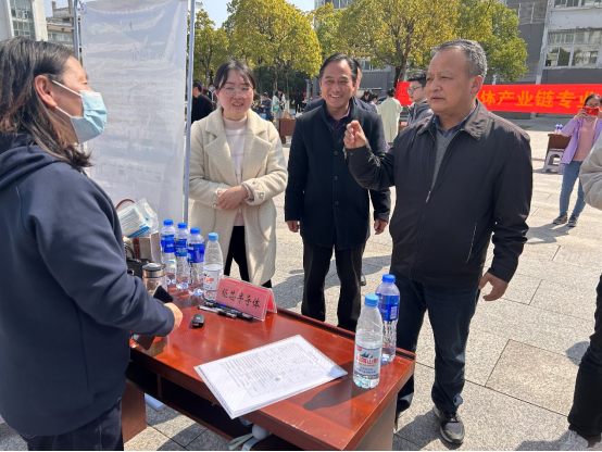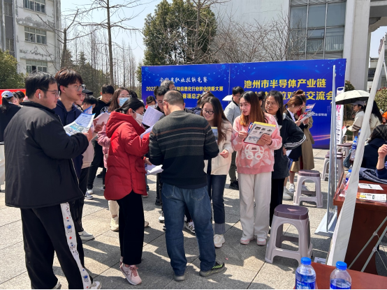 3月5日,池州市半导体产业链专业人才岗位对接交流会暨人才专场招聘活动在beat365官网博古楼广场举行。院党委委员、副院长阳光宁,池州市经开区党工委委员、党群工作局局长钱志华、池州市人社局党组成员、副局长陈胜昔出席了活动。
