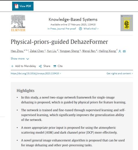 近日,大数据与人工智能学院青年教师周昊以第一作者在人工智能领域国际顶级刊物Knowledge-Based Systems(中科院SCI一区Top期刊,影响因子:8.139)发表论文《Physical-priors-guided DehazeFormer》。