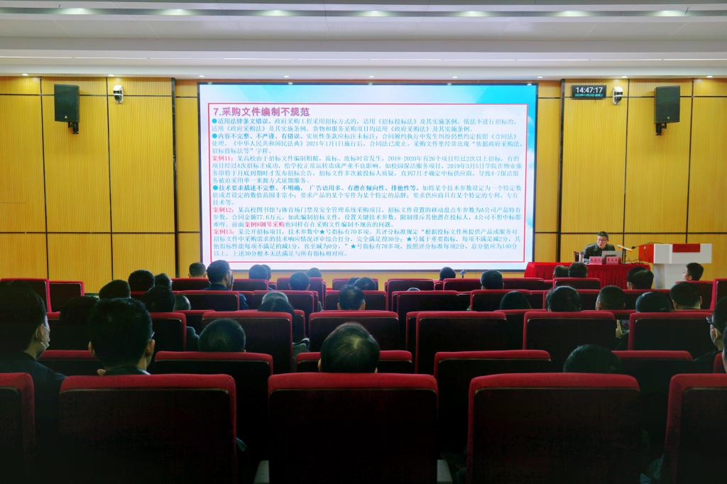 吕刚在主持报告会时强调,学校在十四五如何高质量发展、如何更好的推进个人工作,不仅需要各单位各部门了解招标采购工作中的风险防控点,同时还需要知法、懂法、守法,运用好法律法规,才能为学校建设特色鲜明的地方应用型高水平大学贡献中坚力量。
