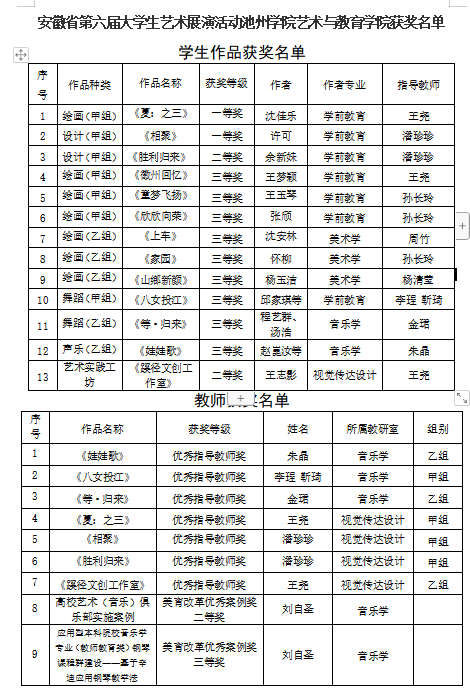 近日,省教育厅公布了全省第六届大学生艺术展演活动获奖名单,beat365官网艺术与教育学院学生获得甲组一等奖2项、二等奖1项、三等奖4项,乙组三等奖5项,艺术实践工坊二等奖1项,美育改革优秀案例奖二等奖1项、三等奖1项。潘珍珍、王尧、朱晶、金珺、李珵、靳琦获“优秀指导老师奖”。