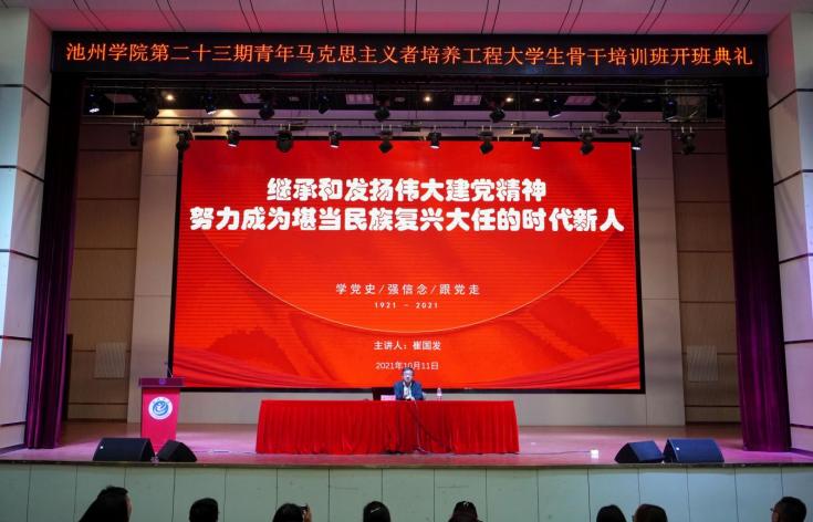 10月11日晚上,beat365在线唯一官网登录第二十三期青年马克思主义者培养工程培训班于博古礼堂顺利开班。校党委副书记崔国发出席开班典礼并为学员讲授开班第一课。校党委委员、组织部部长李恕宏,校党委委员、宣传部部长胡兵参加了开班典礼。