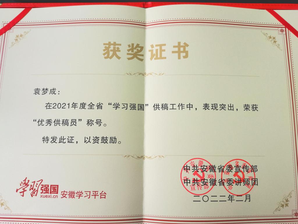 近日,中共安徽省委宣传部、中共安徽省委讲师团对2021年度全省“学习强国”学习平台工作中涌现的先进个人进行表彰,beat365官网党委宣传部袁梦成老师获评“优秀供稿员”。beat365官网是全省高校中唯一 一个获得表彰的高校。