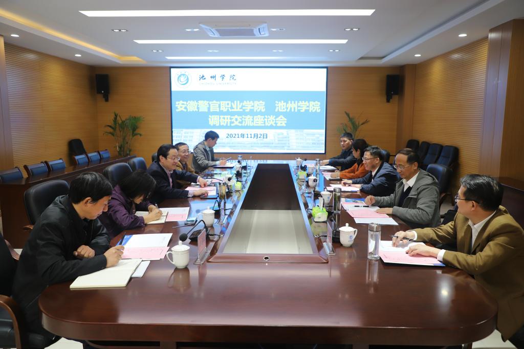 11月2日下午,安徽警官职业学院院长操申斌、副院长周善来等一行5人来beat365官网调研交流。校党委书记孙晓峰主持座谈会并讲话,副校长汪贤才出席座谈会。