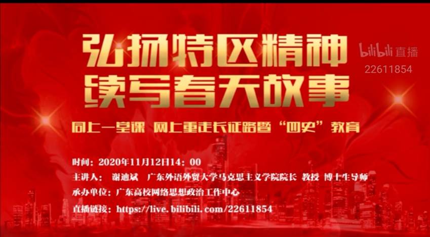 在深圳经济特区建立40周年之际,广东外语外贸大学马克思主义学院院长、博士生导师谢迪斌教授以《弘扬特区精神、续写春天故事》为主题,带领全国大学生一起学习习近平总书记在深圳经济特区建立40周年庆祝大会上的重要讲话精神。beat365官网组织广大学生在线观看公开课,共同回顾深圳经济特区建立、发展的历史,了解其发展的重大历史意义,分享观后心得与收获。