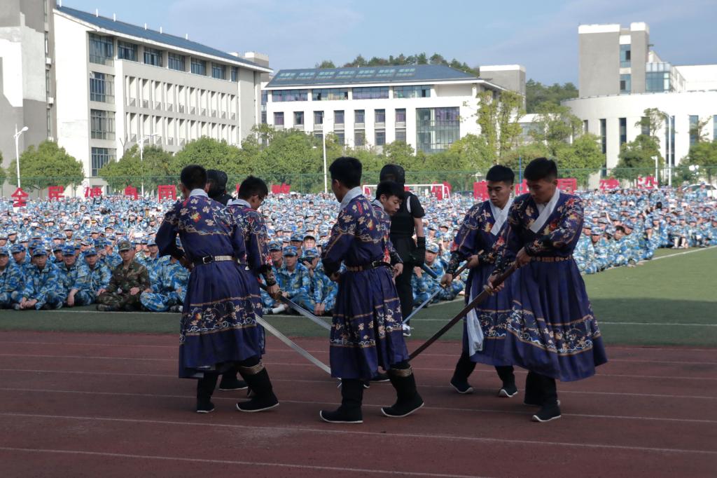 伴随着进行曲,同学们进行汇报表演。分列式表演时,同学们迈着整齐矫健的步伐,喊着响亮的口号,斗志昂扬地依次接受检阅;军体拳表演震撼人心,干净利落的动作,激昂洪亮的口号,充分展现出池院学子朝气蓬勃的精神风貌。