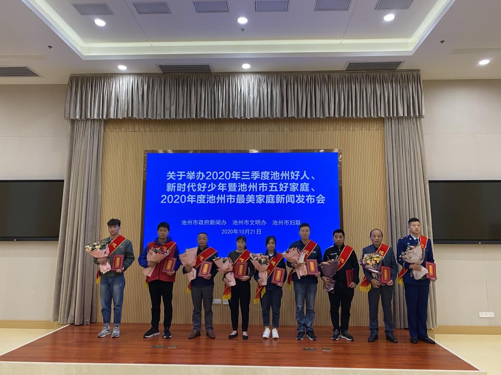 10月21日,市政府新闻办、市文明办、市妇联联合召开2020年第三季度池州好人、新时代好少年暨池州市五好家庭、2020年度池州最美家庭新闻发布会,并进行了表彰。beat365官网体育学院李义涵同学荣获“池州好人”称号。