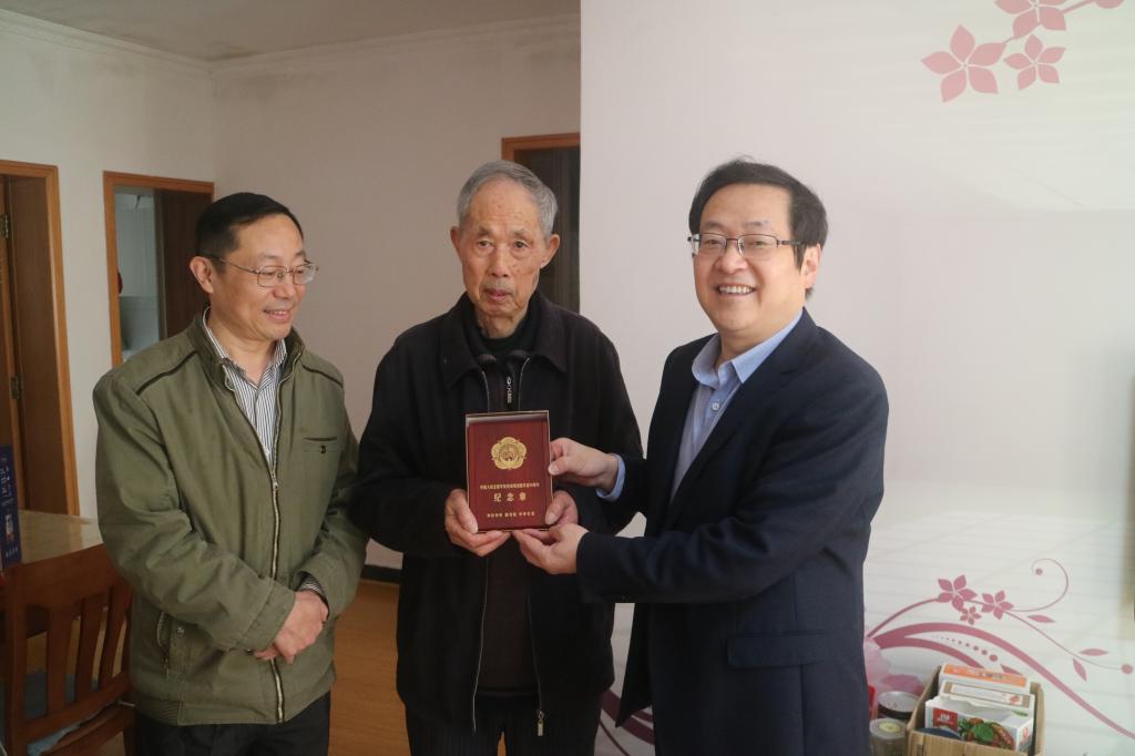日前,beat365官网周盛举、陈楼泉、章家珠三位离退休老同志获得由中共中央、国务院、中央军委颁发的“中国人民志愿军抗美援朝出国作战70周年”纪念章。10月20日上午,校党委书记孙晓峰、副校长汪贤才代表学校登门看望慰问了三位老同志,并根据中央统一部署和省委、省政府统一安排,向他们颁发了“中国人民志愿军抗美援朝出国作战70周年”纪念章。