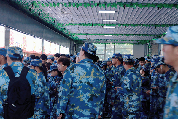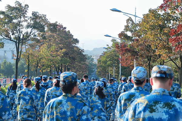 日落西山,流景扬辉,身着迷彩服的新生熙熙攘攘地挤满了整条道路,构成了每年一度特有的风景线。