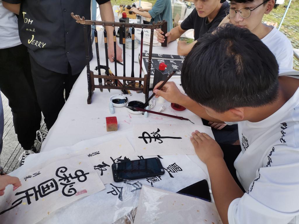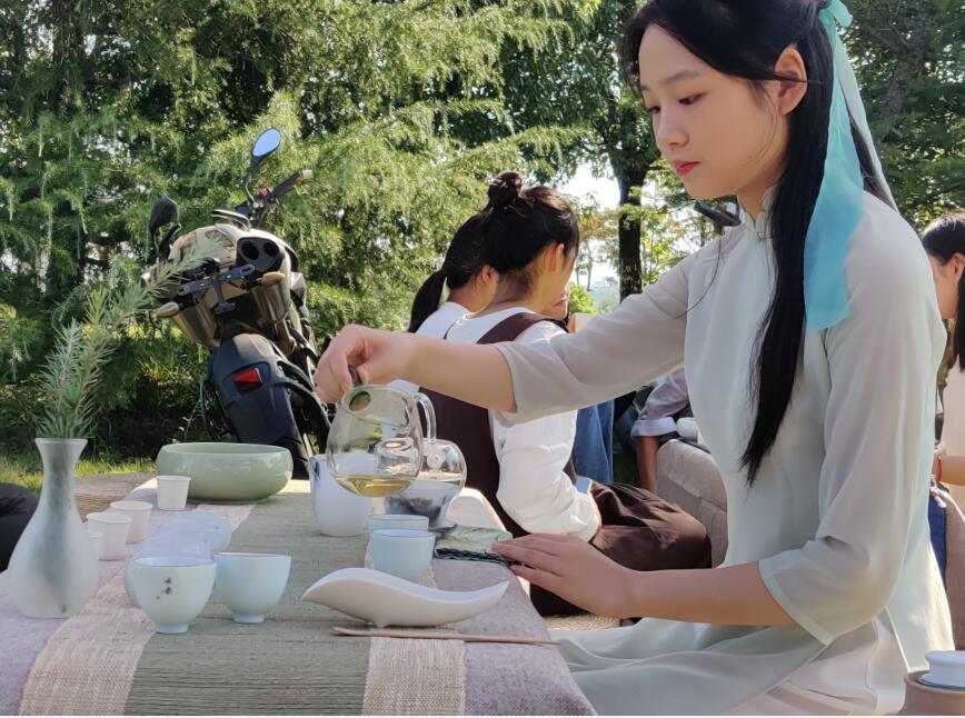 10月1日禅茶社与清泉书画社在一食堂南边联合举办“以茶会众友,笔墨寄浓情”活动,现场演奏了琵琶曲《我和我的祖国》,进行了泡茶、盖碗等茶艺表演,同时进行了欧体、颜体书法展示,共同手写书签、团扇,以书法送祝福。