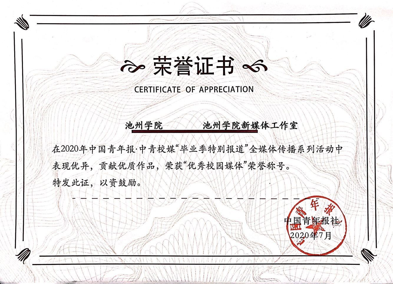 由中国青年报·中青校媒举办的2020年“毕业季特别报道”全媒体传播系列活动中,beat365官网新媒体工作室积极参与,制作优质作品,并荣获了“优秀校园媒体”荣誉称号。