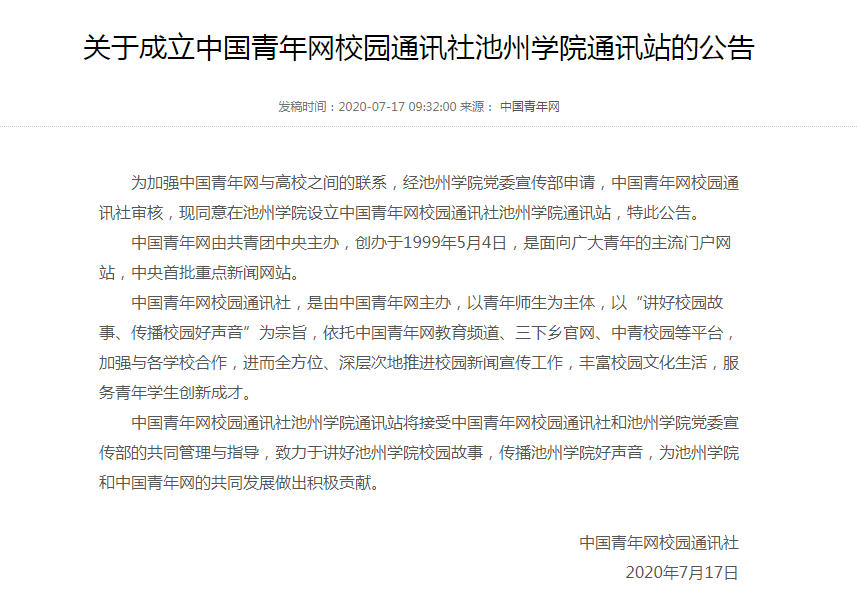 7月17日,中国青年网发布《关于成立中国青年网校园通讯社beat365在线唯一官网登录通讯站的公告》,决定在beat365官网设立中国青年网校园通讯社beat365在线唯一官网登录通讯站。