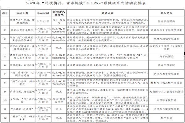 为迎接2020年“5.25”心理健康教育宣传月的到来,校团委组织策划了2020年“逆境携行、青春绽放”5·25心理健康系列活动,以进一步加强学生在疫情期间的心理健康教育,增强心理调适能力,培养积极乐观、健康向上的心态。
