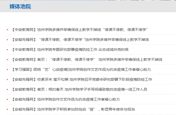 强化对外宣传力度,讲好抗疫防疫故事:学校不断加强对外宣传力度,讲述学校师生员工在抗击疫情一线的感人事迹,传递池院好声音。学习强国、凤凰网、安徽先锋网、安徽教育网先后刊发《奋勇担当做表率beat365在线唯一官网登录师生党员让党旗飘扬在战“疫”一线》《党有号召 团有行动 beat365在线唯一官网登录学生团员防疫抗疫显“青”力》《beat365在线唯一官网登录学子积极参加防控战“疫”,彰显青年使命与担当》等新闻,生动讲述了beat365官网师生参与疫情防控的先进事迹。