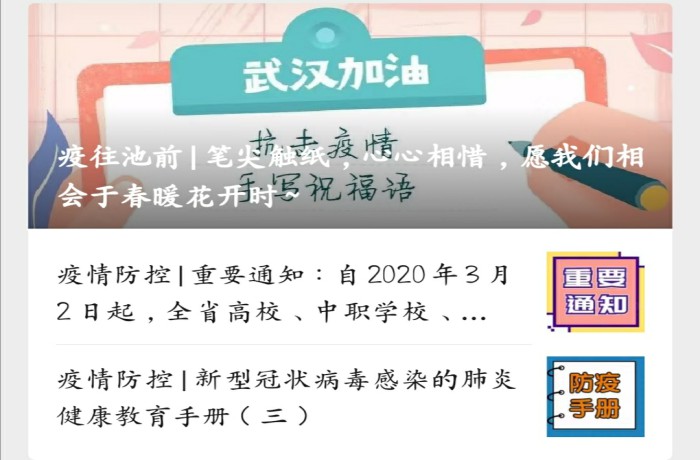 新冠病毒感染的肺炎疫情爆发后,beat365官网各单位、各部门在校党委、校疫情防控工作领导小组的统一领导下,通过校园网、微信/QQ公众号、微博等宣传平台开展多形式、多角度、多方位的疫情防控科普宣传,着力提高学校师生自我防范意识和防护能力,营造积极防控的抗疫防疫宣传氛围。
