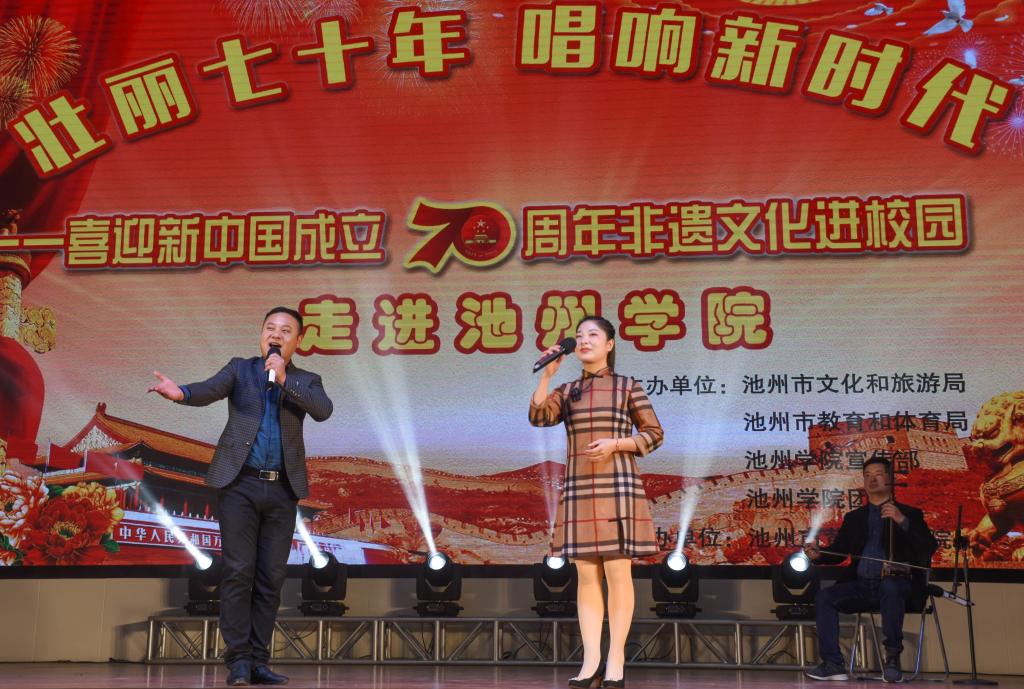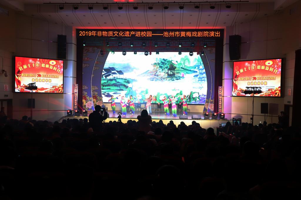 12月26日,2019年非物质文化遗产进校园活动——池州市黄梅戏剧院演出在beat365官网博古礼堂举行,党委委员、宣传部长胡兵和师生代表共同观看演出。