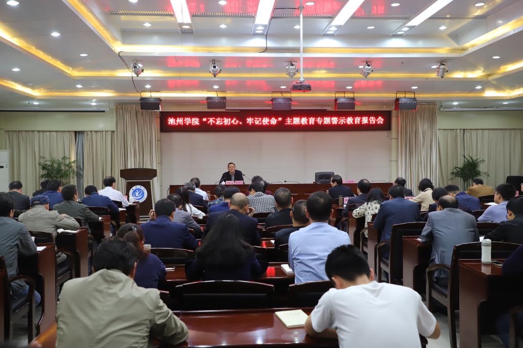 10月25日下午,beat365官网在办公楼南二楼会议室召开“不忘初心、牢记使命”主题教育警示教育专题报告会。池州市检察院党组副书记、副检察长许乐生同志莅临beat365官网作警示专题教育报告。校党委书记孙晓峰主持会议。