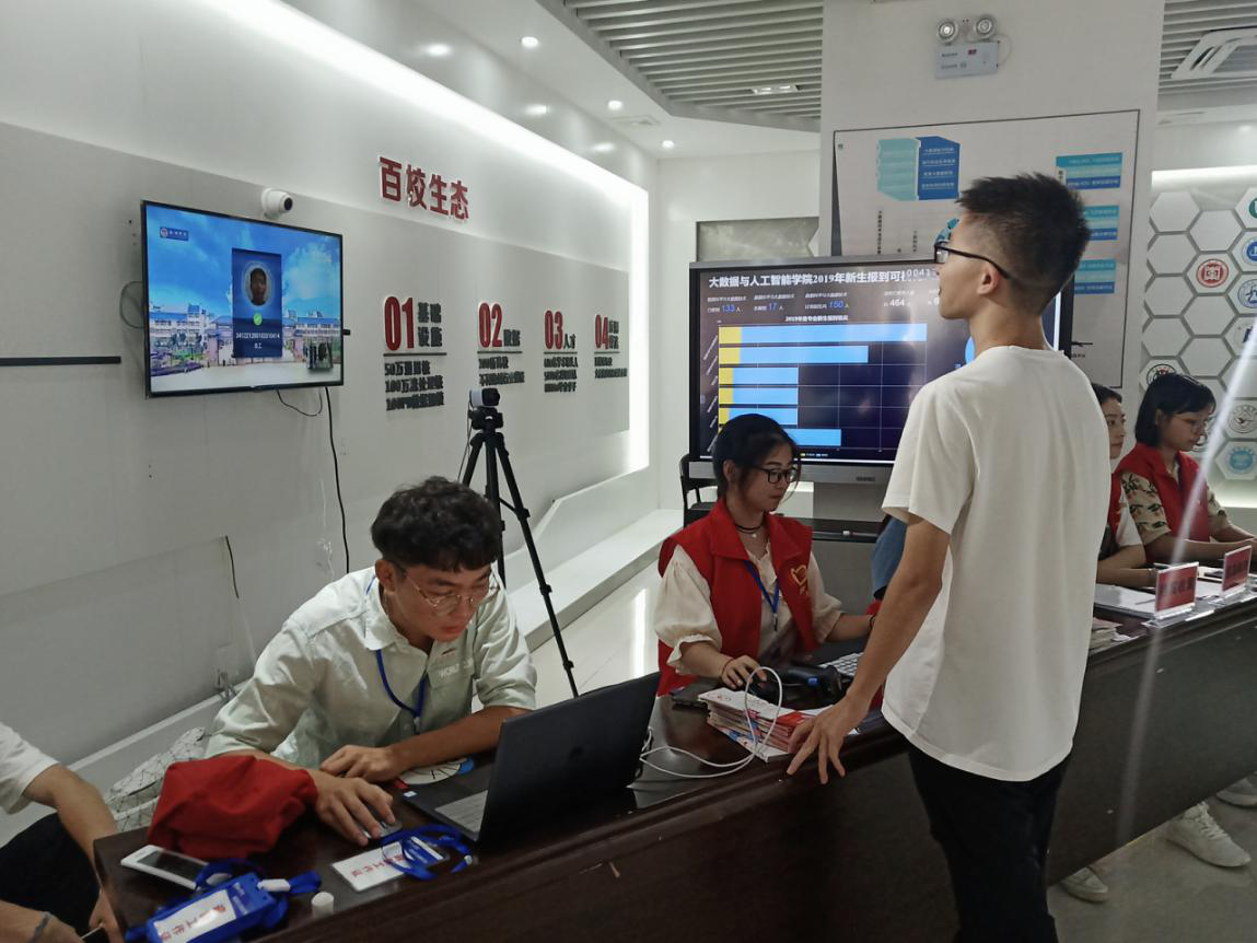 今年,各学院结合专业设置开展了形式多样的特色迎新。大数据与人工智能学院开启人脸识别系统,通过“刷脸”就可以获取新生有关信息,办理入学手续,提高工作效率。2017级云计算专业学生徐慧琳说:“今年迎新速度比去年大有提升,在短时间内能够完成多名新生的信息录入。”同时,在报到大厅设有电子显示屏,实时动态掌握新生入学数据。